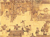 從《清明上河圖》上可以清晰地看到,商人比比皆是,商品琳瑯滿目。汴河兩岸店鋪林立,街道上游人如織。穿過城門進入內(nèi)城,更是一派熱鬧繁華光景。 ??在市場布局上,汴京打破了唐朝市坊分家的格局,商鋪開設較為自由,除了固定鋪面,游商還可沿街叫賣或擺攤設點。