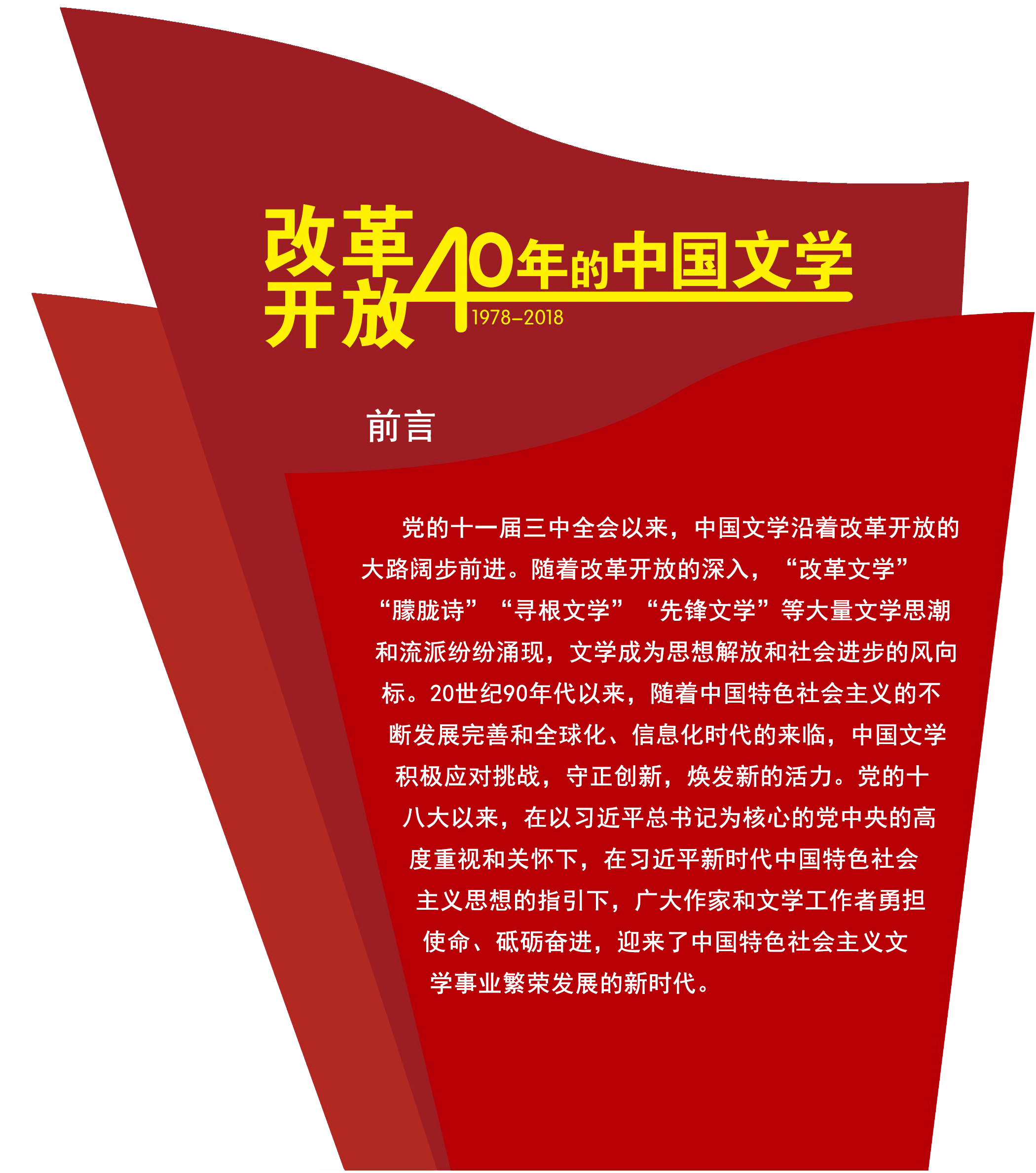 改革開放40年,是當(dāng)代文學(xué)加快自我更新和發(fā)展腳步的40年。中國作家置身全球化背景和現(xiàn)代化進(jìn)程,在外來文藝思潮此起彼伏、文學(xué)觀念不斷更迭中大膽“拿來”,勇于探索,在不斷創(chuàng)新、汲取營養(yǎng)中又能夠始終立足本土站穩(wěn)腳跟……