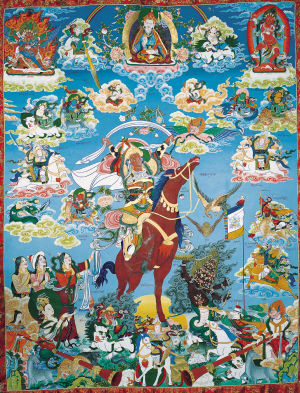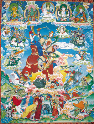 過去通過口耳相傳方式傳承的《格薩爾》,在影像時(shí)代將以生動(dòng)的形式呈現(xiàn)在銀幕上,令人期待。唐卡《格薩爾征戰(zhàn)圖。 資料圖片