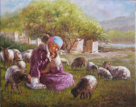 一個民族的生產(chǎn)生活方式會對新一代人的心理素質(zhì)的形成產(chǎn)生深遠(yuǎn)的影響;而民族心理素質(zhì)的差異,就在于一代代人內(nèi)心情感的差異。作品中寫到:“我摟住蜜糖的脖子,讓她把頭枕在我的肚子上,/感受著她呼吸的一起一伏,/我倆漸漸進入夢鄉(xiāng)?!边@既表達出游牧民族的生活習(xí)性,更展現(xiàn)著一個牧羊少女特有的情懷。