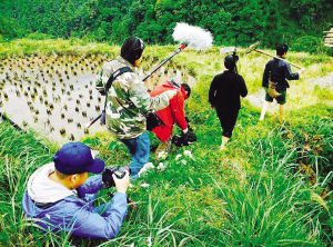 攝制組跟隨少數(shù)民族群眾拍攝他們的勞作過程。
