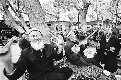 圖為喀什地區(qū)莎車縣阿曼尼沙汗公園內(nèi),民眾觀看木卡姆藝人演唱。 圖片來源:中國(guó)旅游報(bào)