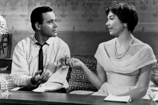 這是棋子和玩物、被侮辱與被損害者的愛(ài)情。然而,比起《熱情如火》,這兩個(gè)角色顯然得到了更多的真情實(shí)感。庫(kù)布里克的“簽名”是浴室,每部電影 里都有一幕發(fā)生在浴室,而懷爾德的“簽名”是“牌桌”,幾乎每部電影都有人在打牌。懷爾德認(rèn)為,他最早受到的人性教育是在臺(tái)球室,在那兒他看慣了賭局, “關(guān)于人性我學(xué)到了很多,沒(méi)有一樣是值得贊許的”。這樣認(rèn)識(shí)這個(gè)世界的他,難怪會(huì)執(zhí)著地喜歡以騙局構(gòu)筑故事。《日落大道》里玩牌的是“蠟像”們,《熱情如 火》里則是黑幫,而《桃色公寓》以一個(gè)玩牌的場(chǎng)景結(jié)束。那是只屬于巴克斯特和弗蘭兩個(gè)人的牌局。