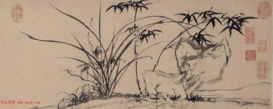 此手卷畫蘭、菊、竹三段,各有文氏親筆題詠。用筆寫意,簡率之中見生動(dòng)秀逸之致,墨色清潤淡雅,顯示了詩、書、畫結(jié)合的筆墨境界。中國傳統(tǒng)文化以擬人化的手法,通過褒揚(yáng)蘭、菊、竹的自然屬性而歌頌或表彰文人的道德品質(zhì),體現(xiàn)了中國花卉畫的特殊功能。