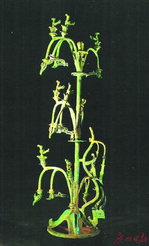 《山海經(jīng)》中記載說:“湯谷上有扶桑,十日所浴,在黑齒北,居水中,有大木,九日居下枝,一日居上枝。”三星堆出土的這棵青銅神樹正是這一傳說的真買寫照。