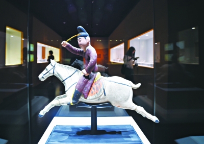 唐代馬球運動曾風靡全國,關中、江南、貴州都有相關文物和文獻可以證明這一點。而新疆吐魯番阿斯塔那出土的“打馬球俑”,也為這份馬球運動分布圖增加了一站。在此次展出的各類俑人中,打馬球俑尤其精致,西域良馬配上彪悍的騎師,別有風韻。