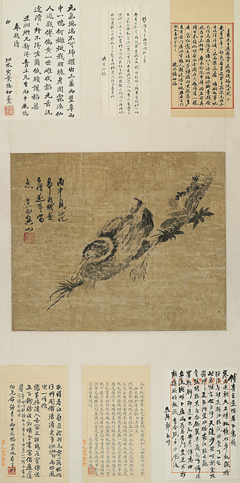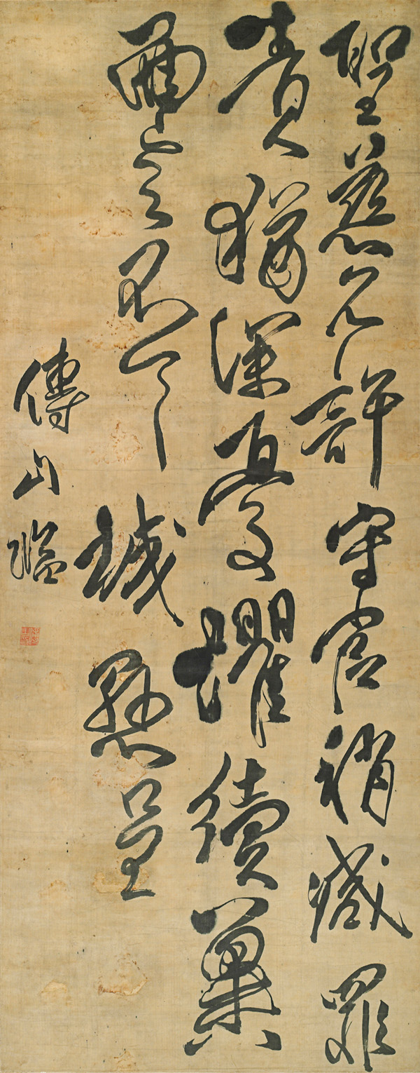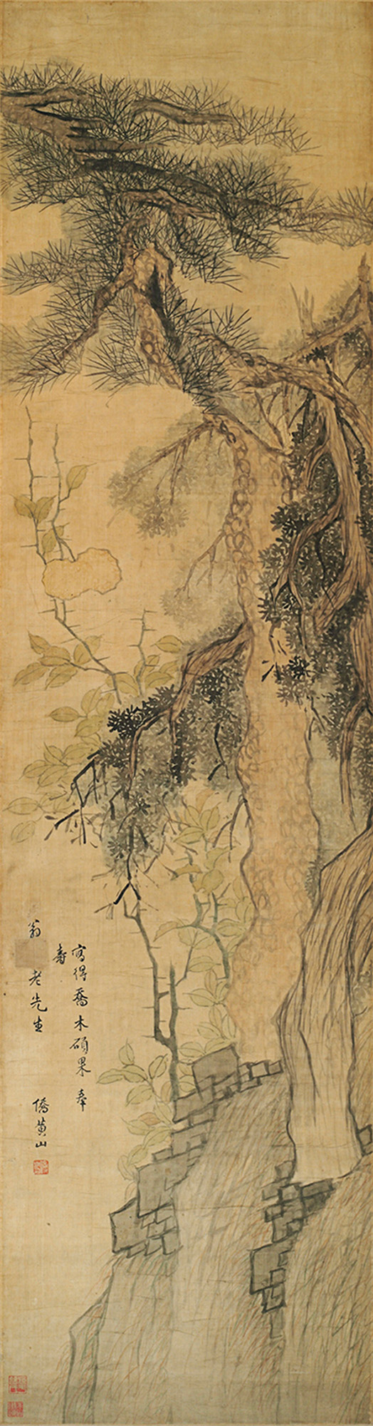 傅山最初如何習(xí)畫(huà),師承何人,今已不得其詳。但傅山對(duì)書(shū)畫(huà)方面的天賦和造詣早年就顯現(xiàn)出來(lái),在他二十六歲時(shí)曾被收藏家黃雙鳳請(qǐng)為所藏宋元書(shū)畫(huà)鑒賞。另載傅山曾與回族畫(huà)家梁檀相交篤甚,時(shí)常前往請(qǐng)教,并撰有傳記。從現(xiàn)存梁檀書(shū)畫(huà)看,傅山與其有一定的淵源關(guān)系。傅山繪畫(huà)作品現(xiàn)存不多,皆以山水、松石、花卉、禽鳥(niǎo)等見(jiàn)長(zhǎng),屬文人逸格一派,且風(fēng)格多樣,博采眾長(zhǎng),或取徑院體,或法元人寫(xiě)意,或賦彩整密,或醉墨淋漓……,不落古人窠臼,主在性情及認(rèn)知的表達(dá),以氣骨勝,《畫(huà)征錄》載有:“傅青主畫(huà)山水,皴擦不多,丘壑磊珂,以骨勝,墨竹也有氣”。從傅山《題自畫(huà)老柏》詩(shī)可知揮毫潑墨概發(fā)于意者:“老心無(wú)所住,丹青莽蕭瑟……擲筆蕩空胸,怒者不可見(jiàn)。笑觀身外物,消遣又幾日。”