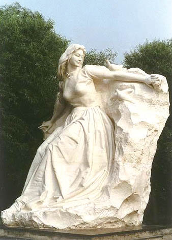 潘 鶴:高度有限制,就從寬度上考慮。雕像橫向兩側(cè)擴(kuò)展,基座上的少女上身前傾,雙手向后護(hù)住象征和平的白鴿,所以,從視覺(jué)上看,整個(gè)雕像體積寬大,有分量。