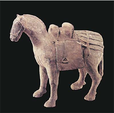 南京北郊、緊鄰長(zhǎng)江的象山上,安葬著王導(dǎo)堂弟王彬的家族墓。時(shí)代約在東晉初年的7號(hào)墓中,出土了一件陶鞍馬,長(zhǎng)38.5厘米,高34.5厘米。頭部有完整的轡頭,背部有高橋鞍,兩側(cè)還各懸掛了一件三角形的馬鐙。這匹馬看上去有點(diǎn)“萌呆”,與顯赫家世相比似不般配,也遠(yuǎn)不如唐三彩馬矯健駿美,然而它所展現(xiàn)出來(lái)的清晰細(xì)節(jié),使之成為中國(guó)馬具發(fā)展史上里程碑式的代表。