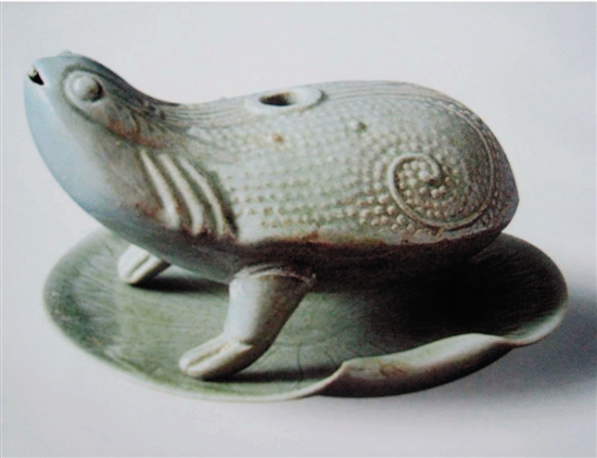 這件青瓷蟾滴是文人雅士案前桌上不可缺少的文房用具之一,其上的蟾蜍形水盂,也稱水注或硯滴,可盛水以備研墨之用,既實用而又十分美觀。造型采用蟾蜍形象,顯然蘊(yùn)含著“蟾宮折桂”的美好愿望,祝福主人金榜題名,登科及第。蟾蜍頭上有角,暗喻長壽吉祥;而身作三足,也正同清代《述異記》所載:“俗語云,三腳蛤蚆無處尋”,“古謂蟾三足”相合(蟾蜍和青蛙一樣有四足,只是從蝌蚪演變成蛙之時,短時間有尾和兩足,古人不明底細(xì),誤以為“三足”,故有三足蟾蜍為世所珍之說),足見它是何等的名貴,寓意更是何等的深刻!杰出的越窯制瓷大師將情態(tài)優(yōu)雅、形神兼?zhèn)涞捏蛤?,與出污泥而不染的荷葉巧妙地結(jié)合在一起,既符合文人雅士的美好祈盼心態(tài)和審美情趣,又是一件富含藝術(shù)美感、價值連城的越窯瑰寶。其獨特新穎的造型,精湛的工藝和靈性非凡的寓意,堪稱中國陶瓷藝苑中的一朵光彩奪目的奇葩!