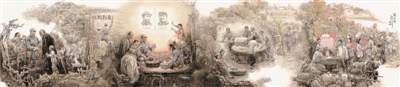出于內(nèi)心的虔誠(chéng),趙志田對(duì)繪畫創(chuàng)作始終保有一顆謙遜之心?!八囆g(shù)創(chuàng)作對(duì)一個(gè)畫家來(lái)說(shuō),首先是一個(gè)學(xué)習(xí)的過(guò)程”,這種學(xué)習(xí)對(duì)他而言不僅是要全方位地了解筆下人和事的精神,更是讓自己受教育、受感染,然后再濃縮、加工表現(xiàn)出這種精神。這對(duì)一位創(chuàng)作者來(lái)說(shuō)尤為重要也難能可貴。了然于胸成為了趙志田下筆創(chuàng)作前必須要做的功課。自1972年開始,趙志田先后五次深入大慶油田體驗(yàn)真實(shí)的工人生活,甚至一呆就是幾個(gè)月,感受極寒環(huán)境帶來(lái)的挑戰(zhàn),與工人同吃同住,由此誕生了以《大慶工人無(wú)冬天》《石油工人一聲吼,地球也要抖三抖》為代表的一批表現(xiàn)大慶工業(yè)建設(shè)的作品。到了20世紀(jì)80年代中葉,他決心要做一些力所能及的事,萌生了創(chuàng)作以太行山革命根據(jù)地為主題的抗日戰(zhàn)爭(zhēng)題材畫卷,之后曾多次奔赴太行山訪問(wèn)革命老區(qū),一路行走一路采訪當(dāng)年的親歷者或見聞?wù)撸M力使畫卷中的人物符合當(dāng)時(shí)的年齡、身份、氣質(zhì),誕生了《太行情》《烽火太行》等一批作品。即便在今天創(chuàng)作《遵義會(huì)議·偉大轉(zhuǎn)折》時(shí),趙志田依然堅(jiān)持了這多年的習(xí)慣,和夫人奔赴遵義會(huì)議舊址,盡最大努力搜集圖像、考證資料,甚至當(dāng)年會(huì)議時(shí)的坐具也都經(jīng)過(guò)了一番考證,因?yàn)閷?duì)趙志田來(lái)說(shuō)“用中國(guó)畫表現(xiàn)群像本身就不容易,而要表現(xiàn)一個(gè)會(huì)議且都是真實(shí)的歷史人物就更加困難”。歷史題材需要嚴(yán)肅性,更需要畫家對(duì)其有正確的認(rèn)識(shí)。趙志田就是這樣一個(gè)不怕“折騰”的畫家。