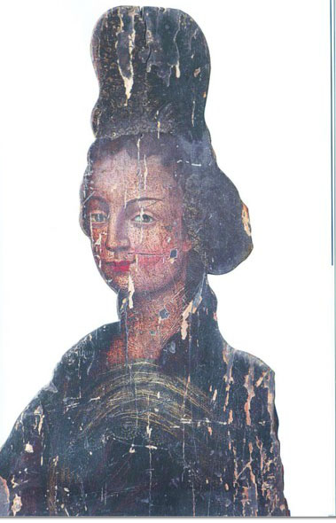 ●油畫木美人 兩幅在厚木板上的古代仕女圖像。畫面是兩個與真人一般大小的西洋美女,身高均160厘米,穿低領漢式襟衣。兩位“木美人”鵝蛋臉,鼻梁高挺,眼窩凹陷,立體感很強,有明顯的西洋人特征。研究者認為,此件“木美人”是我國最早的油畫作品,其藝術性不遜于意大利油畫家達·芬奇的《蒙娜麗莎》。