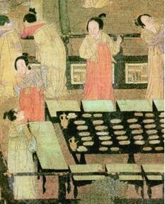 畫(huà)中的仕女頭梳發(fā)髻,身著高腰襦裙,位于畫(huà)面中心的水平線(xiàn)上。工字形廊院內(nèi)的兩名仕女似乎在進(jìn)行灑掃事宜,左邊青綠琉璃瓦裝飾的回廊中的仕女則正在為稍后的乞巧活動(dòng)備置碗碟、茶酒果品等什物。乞巧活動(dòng)在中間天井中達(dá)到高潮,在拼連在一起的兩張黑色圓腳矮方桌周?chē)伺畟兓蜃蛄ⅲ坪踉诘却蚯苫顒?dòng)的正式開(kāi)始。當(dāng)時(shí)垂足而坐的高型坐具尚未普及,室內(nèi)起居家具主要是低矮的桌案,然后在地上鋪設(shè)茵席或矮凳。七夕風(fēng)俗正如晉人周處在《風(fēng)土記》中所記載的:“七月,俗重是日。其夜,灑掃,于庭露施機(jī)筵,設(shè)酒脯時(shí)果,散香粉于筵上”。并“祈請(qǐng)于河鼓、織女。見(jiàn)者,便拜而愿:祈富、祈壽、無(wú)子祈子,唯得乞一,不得兼求”。不知這滿(mǎn)庭的仕女,在祈望著什么?或許她們希冀能同唐明皇與楊玉環(huán)一般在“七月七日長(zhǎng)生殿,夜半無(wú)人私語(yǔ)時(shí)”向織女許諾“在天愿作比翼鳥(niǎo),在地愿為連理枝”;或許她們只是想在銀燭秋光、如水夜色中,“坐看牽??椗恰?。