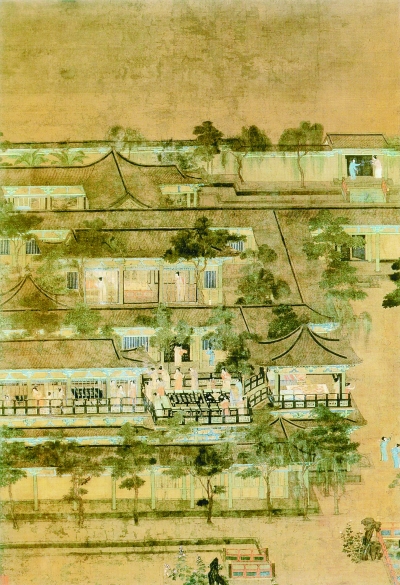 在這座樓閣疊起的王苑公館內(nèi),建以巷道分割的多進(jìn)大小院落,木結(jié)構(gòu)建筑的前廳、后廊,樹(shù)蔭掩映,四周環(huán)以回廊。中軸線(xiàn)左右側(cè)建有多座較小院落,明間裝門(mén),左右間裝窗。正如畫(huà)面所示,當(dāng)時(shí)的門(mén)主要是版門(mén),窗一般為直欞窗和破格子欞窗。廊廡環(huán)繞,一方面通過(guò)門(mén)和道路組織最佳觀(guān)賞路線(xiàn),另一方面又通過(guò)重重廊廡增加縱深感,形成建筑物內(nèi)向的封閉式院落,既表現(xiàn)了豪貴生活的驕縱富有,又顯示了深宮仕女的凄清冷寂。