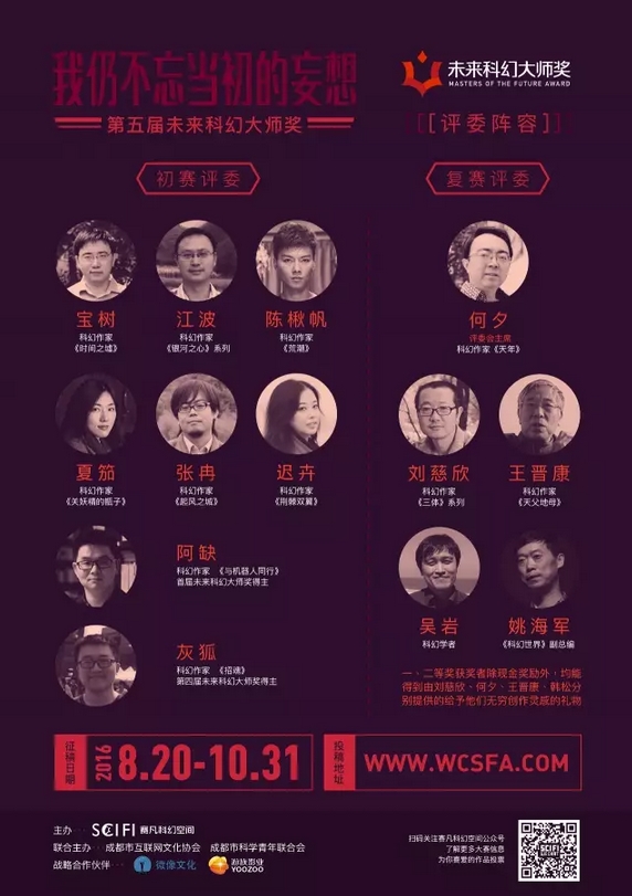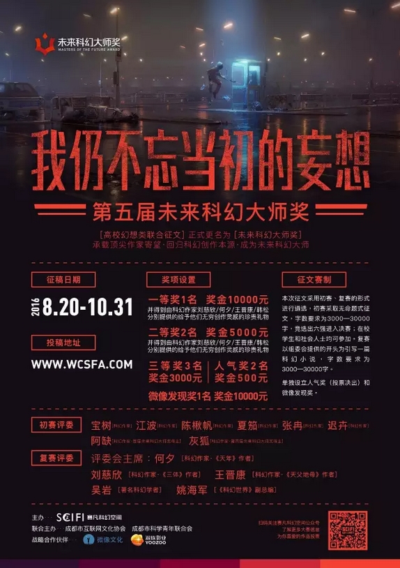 經(jīng)過4年的發(fā)展,“未來科幻大師獎”累積投稿量近千篇,同時涌現(xiàn)出阿缺、灰狐、胡紹晏、念語等一批活躍在科幻文學(xué)創(chuàng)作一線的科幻作家,其中歷屆征文比賽中的部分獲獎作品也正在影視轉(zhuǎn)化的制作過程中。2016賽凡科幻空間攜手成都市互聯(lián)網(wǎng)文化協(xié)會、成都市科學(xué)青年聯(lián)合會正式啟動第五屆“未來科幻大師獎”,我們熱誠期待您的參與。