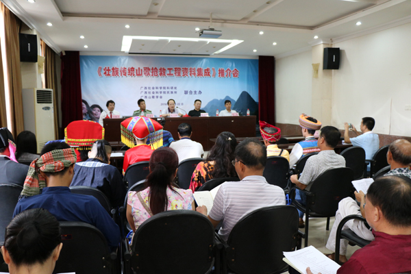 2016年8月22日,由廣西社會(huì)科學(xué)院科研處、廣西社會(huì)科學(xué)院民研所、廣西山歌學(xué)會(huì)聯(lián)合召開的《壯族傳統(tǒng)山歌搶救工程資料集成》推介會(huì)在南寧舉行。參加會(huì)議的有來自北京的《解放軍報(bào)》文化部副主任、主編曹慧民,中國大旗文化產(chǎn)業(yè)集團(tuán)董事局主席顏建國,廣西社會(huì)科學(xué)院副院長黃天貴,廣西社科聯(lián)副巡視員何明,廣西社會(huì)科學(xué)院科研處長蔣斌等領(lǐng)導(dǎo)同志,以及廣西民族大學(xué)、廣西師范學(xué)院、廣西山歌學(xué)會(huì)、廣西壯歡學(xué)會(huì)等單位的領(lǐng)導(dǎo)、專家教授、歌王、歌手和廣西日?qǐng)?bào)、南國早報(bào)、廣西民族報(bào)等媒體記者共40余人。會(huì)上,與會(huì)領(lǐng)導(dǎo)和專家教授對(duì)《壯族傳統(tǒng)山歌搶救工程資料集成》工作作了肯定的評(píng)價(jià),并對(duì)民族傳統(tǒng)文化的繼承和發(fā)展問題發(fā)表自己的意見和建議。廣西社科院民研所楊昌雄副研究員代表課題組作《壯族傳統(tǒng)山歌搶救工程資料集成》調(diào)研報(bào)告。