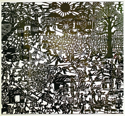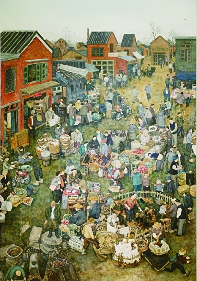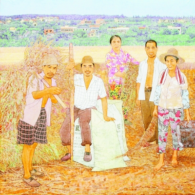 藍(lán)天之下,郁郁蔥蔥的遠(yuǎn)景中,新民居錯落分布,相隔金黃色的稻浪,前景聚焦于中國社會最本色的農(nóng)村收獲場景,將一年中最重要的時段濃縮在喜悅的瞬間,反映了作者濃郁的鄉(xiāng)土情感和人文關(guān)懷。作者營造的世界有著電影鏡頭般的形式構(gòu)成和形體塑造,表現(xiàn)出了繪畫的當(dāng)代性。