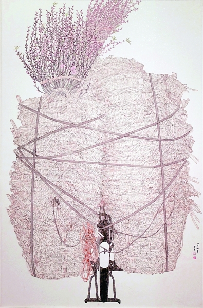 作品構(gòu)思獨(dú)特,生動刻畫了農(nóng)民趕集回家的一幕。自行車上滿載的籮筐插上了兩株桃花,帶著濃濃的廣東生活韻味,傳遞出勞動者對美好生活的向往。