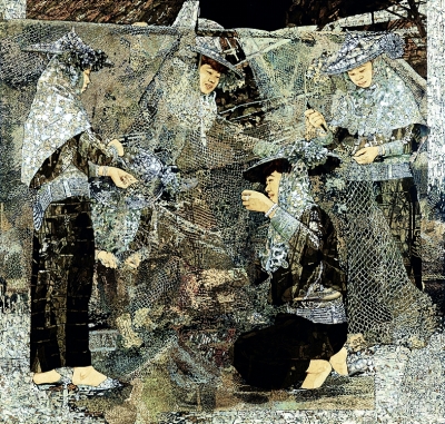 作者通過對惠安女織網(wǎng)的勞作場面的描繪,表現(xiàn)出惠安女的獨(dú)特美感和精神品質(zhì),體現(xiàn)出對本土文化堅守的情感。在創(chuàng)作中,作者拋棄了惠安女服飾本身的艷麗顏色,在單純的色調(diào)環(huán)境中尋找微妙變化,在層次空間的表現(xiàn)上更為生動自由,也使畫面意境深遠(yuǎn)。