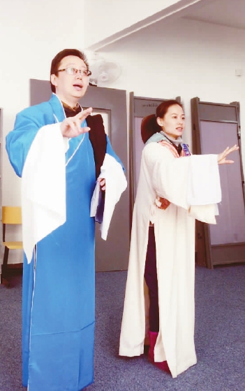賀紹倫(左)在上海戲劇學(xué)院進(jìn)修時(shí)與同學(xué)學(xué)習(xí)戲曲知識(shí)