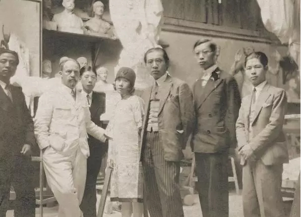 劉海粟一行到訪巴黎美院教授、著名雕塑家朗特斯基工作室。照片人物:朗特斯基(左二)、劉抗、傅雷、劉海粟、張韻士(右一至右四)
