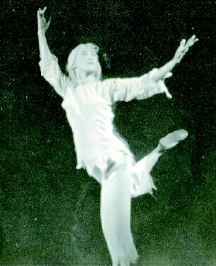 《敵后交通員》就是我學(xué)習(xí)編導(dǎo)后編排的第一個(gè)小舞劇了。它取材于當(dāng)時(shí)一部流行的電影《雞毛信》,故事講述的是一個(gè)村姑——敵后交通員,送雞毛信給八路軍,為了安全起見,她女扮男裝,變成一個(gè)放羊娃,順利送信的故事。除了編導(dǎo),我還演這個(gè)敵后交通員,因?yàn)槭桥缒醒b嘛,有很多如“旋子”、“側(cè)空翻”等男孩子做的高難度動(dòng)作,我都需要去做。這對(duì)于我是有一定難度的,然而,我那一股不服輸?shù)膭蓬^告訴我,我必須克服它,于是,我就去舞校找來老師教,自己下功夫練,再加上自己本身也有戲曲的功底,很快便克服了。