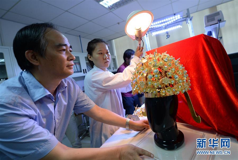 9月5日,文物保護工作者在陜西省文物保護研究院展示隋煬帝蕭后冠仿制品。(新華社記者李一博攝影報道 圖片來源:新華社客戶端)