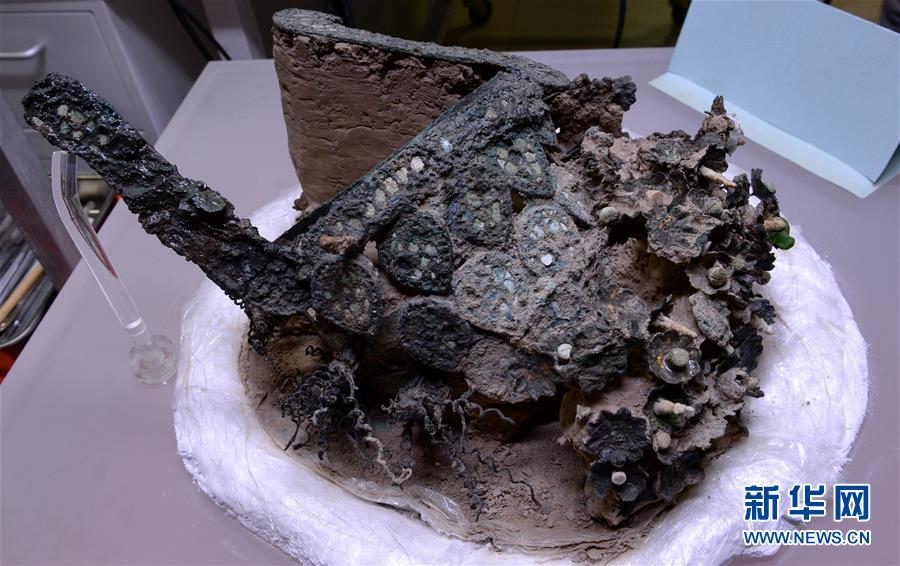 這是在陜西省文物保護研究院拍攝的隋煬帝蕭后冠文物原件(9月5日攝)。 9月5日,陜西省文物保護研究院聯(lián)合揚州市文物考古研究所在西安發(fā)布揚州隋煬帝蕭后冠實驗室考古與保護成果,并公開蕭后冠仿制品實物??脊湃藛T現(xiàn)已確定蕭后冠框架由兩博鬢、呈十字交叉的2道梁和呈環(huán)帶的3道箍組成,還包括12塊水滴形飾、13棵花樹,冠主要采用銅、金、玻璃、漢白玉、珍珠等10種材料制成。 2013年3月,揚州市西湖鎮(zhèn)司徒村曹莊發(fā)現(xiàn)兩座磚室墓,后經(jīng)專家確認為隋煬帝楊廣墓與蕭后墓。在蕭后墓出土的這件蕭后冠是目前國內(nèi)考古發(fā)現(xiàn)等級最高、保存最完整的冠。 新華社記者 李一博 攝