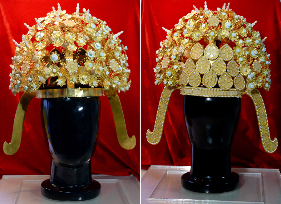 根據(jù)研究發(fā)現(xiàn),蕭后冠的框架是由兩博鬢、呈十字交叉的兩道梁和呈環(huán)帶的三道箍組成。其上花樹13棵,花樹由花梗、花瓣和花蕊等構(gòu)成,在冠后腦位置有12塊水滴形的飾件。經(jīng)過深入分析,還明確了制作蕭后冠所用的銅、金、珍珠、棉、絲等主要材料,以及錘揲、掐絲、鑲嵌、珠化等飾件加工的十幾種工藝。