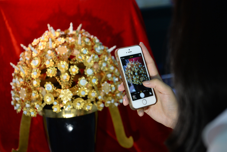 9月5日,記者在陜西省文物保護研究院用手機拍攝隋煬帝蕭后冠仿制品。(新華社記者李一博攝影報道 圖片來源:新華社客戶端)