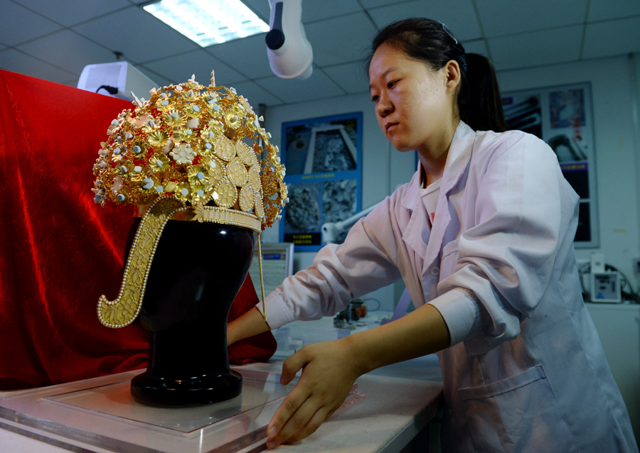 9月5日,文物保護工作者在陜西省文物保護研究院展示隋煬帝蕭后冠仿制品。當(dāng)日,陜西省文物保護研究院聯(lián)合揚州市文物考古研究所在西安發(fā)布揚州隋煬帝蕭后冠實驗室考古與保護成果,并公開蕭后冠仿制品實物??脊湃藛T現(xiàn)已確定蕭后冠框架由兩博鬢、呈十字交叉的2道梁和呈環(huán)帶的3道箍組成,還包括12塊水滴形飾、13棵花樹,冠主要采用銅、金、玻璃、漢白玉、珍珠等10種材料制成。2013年3月,揚州市西湖鎮(zhèn)司徒村曹莊發(fā)現(xiàn)兩座磚室墓,后經(jīng)專家確認為隋煬帝楊廣墓與蕭后墓。在蕭后墓出土的這件蕭后冠是目前國內(nèi)考古發(fā)現(xiàn)等級最高、保存最完整的冠。新華社記者 李一博 攝