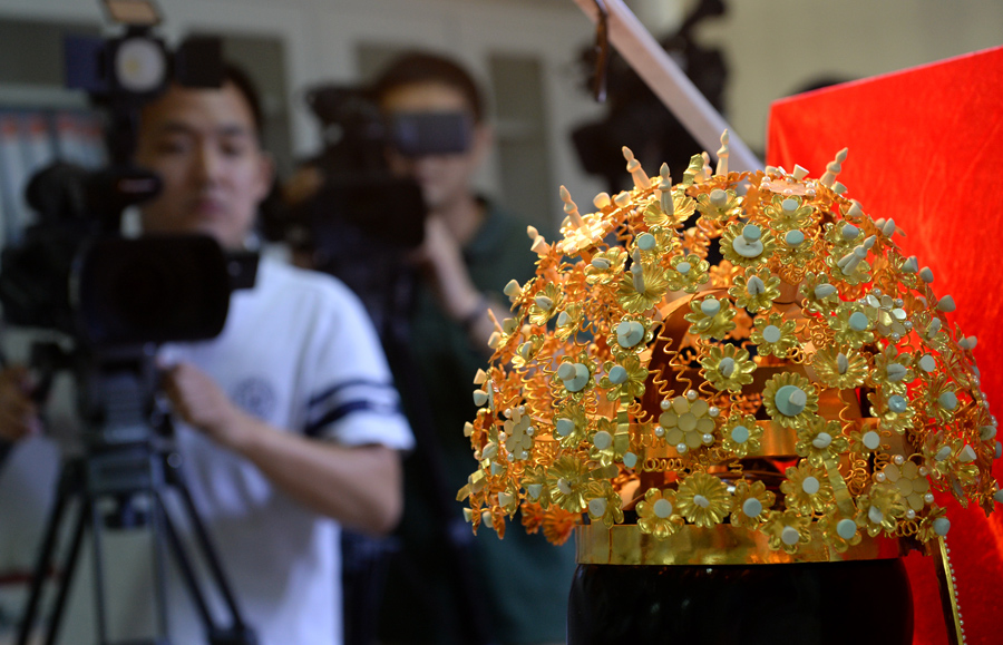 9月5日,記者在陜西省文物保護研究院拍攝隋煬帝蕭后冠仿制品。(新華社記者李一博攝影報道 圖片來源:新華社客戶端)