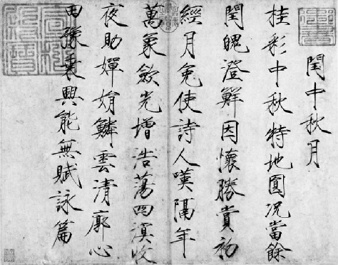 《閏中秋月帖》中所記為一首七言律詩:“桂彩中秋特地圓,況當(dāng)余閏魄澄鮮。因懷勝賞初經(jīng)月,免使詩人嘆隔年。萬象斂光增浩蕩,四溟收夜助嬋娟。鱗云清廓心田豫,乘興能無賦詠篇。”