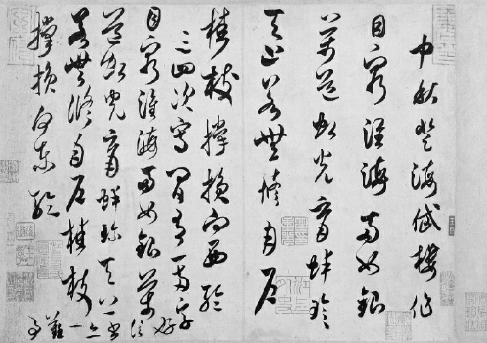 與中秋相關(guān)的法帖,還有一幅收藏于日本大阪市立美術(shù)館的《中秋登海岱樓詩帖》,為宋代書法家、鑒藏家、收藏家米芾所作:“目窮淮海兩如銀,萬道虹光育蚌珍,天上若無修月戶,桂枝撐損向西輪。目窮淮海兩如銀,萬道虹光育蚌珍,天上若無修月戶,桂枝撐損向東輪?!?/p>