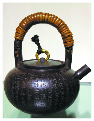 鐵壺的形狀最早就來(lái)源于中國(guó),而壺身的紋飾則更直接地體現(xiàn)了中國(guó)文化。梅林隨手拿起旁邊的一把壺,滔滔不絕:“這把‘大國(guó)壽郎造漢詩(shī)壺’,距今約有150多年,采用失蠟法鑄造,壺的一面是隸書(shū)《長(zhǎng)干行》,另一面是行草《春曉》,壺上的很多紋飾其實(shí)是借鑒了中國(guó)的青銅器……”