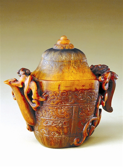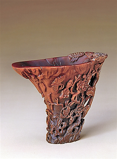 犀角器在古代工藝品中屬曠世奇珍,在今天的藝術(shù)品市場(chǎng)也價(jià)值連城。早在2005年香港蘇富比秋拍,一件明末犀角雕雙螭海棠形杯以1076萬(wàn)港元首次突破千萬(wàn)大關(guān);2006年紐約蘇富比秋拍,一件清康熙尤侃款犀角仙人乘槎杯以203.2萬(wàn)美元成交;2010年香港佳士得春拍,清康熙犀角萊菔尊(“康熙御制”款)和明犀角雕《蘭亭序》杯,均以3986萬(wàn)港元的高價(jià),創(chuàng)造了犀角器拍賣(mài)世界紀(jì)錄。