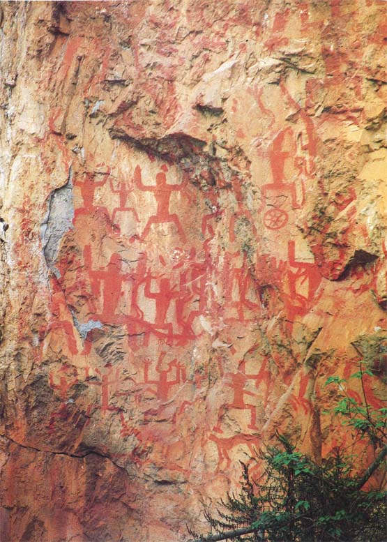 應該指出的是把我國古代巖畫分為南繪北刻的兩大體系,只是從全局出發(fā)而進行的整體性概括。千差萬別的中國古代巖畫,自然會有許多特殊而變異的類型。例如,東南沿海的江蘇連云港將軍崖巖畫就是敲刻而成,不可能劃歸南方高地涂繪型巖畫的行列。內蒙古元代巖畫中就有許多是佛教喇嘛用石灰調和素油后涂繪而成,明顯也不可能納入北方草原敲刻型巖畫之內。正是基于中國古代巖畫所具備的分布的廣泛性、內容的豐富性和技法的多樣性,使其在世界巖畫的寶庫內占有了獨特而重要的藝術地位。