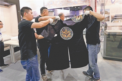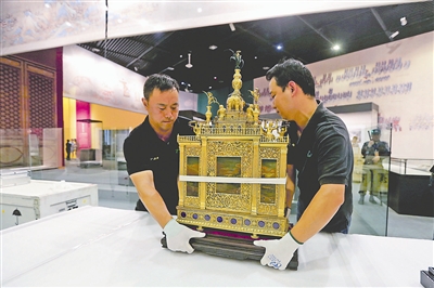 記者注意到,裝文物的木箱一打開,里面除了泡沫填充防震以外,還專門有結(jié)實的木條綁定關(guān)鍵部位,防止文物在箱體內(nèi)晃動。木條本身也進(jìn)行了布條或泡沫纏繞,以免刮碰傷及文物。開箱布展工作按照先置放大型的、具有獨立展柜的文物開始,比如鐘表、盒、座椅之類的重器。為了展陳效果,一些黑色的底部展布需要從雙層玻璃包裹的展柜里取出進(jìn)行除塵處理,幾個工作人員特別用手持小型吸塵器精細(xì)地做著此項工作。