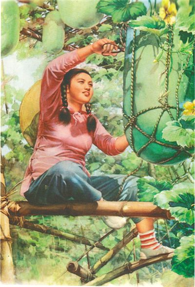 月份牌年畫長期存在著內(nèi)容與形式方面的問題,是不爭的事實(shí)。如“人物類型化,大部分畫上的兒童都是一母所生,婦女都是姊妹;人物只追求浮面的或外表的美,很少能描繪出情神狀態(tài);有些畫單純地注重色彩,畫面顏色不夠調(diào)和,或過分地追求鮮艷,流于庸俗;無論畫人畫物,都缺乏藝術(shù)風(fēng)格;特別是還沒有突破舊有的題材圈子,對于反映現(xiàn)實(shí)生活還努力不夠?!钡林腥A人民共和國成立十周年之際,月份牌創(chuàng)作者的努力與成就開始得到普遍的肯定。金梅生就是有著矚目成就的月份牌年畫畫家,其創(chuàng)作于1955年的《菜綠瓜肥產(chǎn)量高》,就頗受群眾的喜愛,甚至達(dá)到了“到處受到歡迎”的程度,該作不僅入選了第一屆“社會主義國家造型藝術(shù)展覽會”,還被《美術(shù)》評為“建國十年來優(yōu)秀作品”;作于1959年的《冬瓜上高樓》則被認(rèn)為是受到“具有革命現(xiàn)實(shí)主義和革命浪漫主義精神的民歌和群眾美術(shù)創(chuàng)作”的啟發(fā),產(chǎn)生于“深入群眾生活的根基上”的作品,受到美術(shù)界廣泛好評。