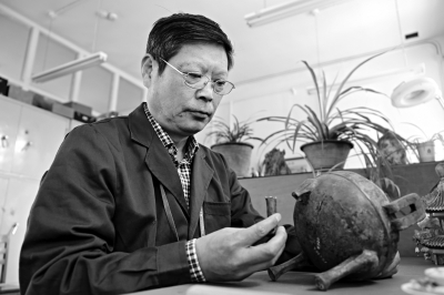 經(jīng)常,他就坐著,對(duì)自己修復(fù)的器物看,皺著眉頭琢磨。別的同事進(jìn)門看到了,仔細(xì)圍著端詳半天,說補(bǔ)得挺好啊,都沒看出修過哪兒啊。王有亮這才心里舒坦了。