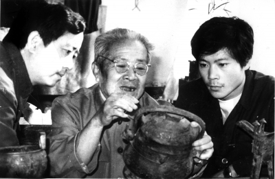 師父趙振茂(中)給王有亮(右)講述青銅器細(xì)節(jié)。