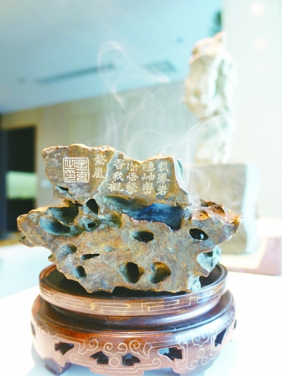 北宋士大夫玩石成風。杜綰的《云林石譜》介紹各地美石。其中提到:相州林慮石,“頗多嵌空,洞穴宛轉(zhuǎn)相通,不假人為。至有中可虛可施香燼,靜而視之,若煙云出沒巖岫間”。衢州常山石(石筍石)“峰巒聳秀,洞穴委曲相通,底座透空,堪施香燼,若煙云縈繞亂峰間?!笨梢娺@種中空、帶孔的奇石,是逃不過愛玩的宋人法眼的,這種孔眼奇石注定要被宋人賦予煙云供養(yǎng)。