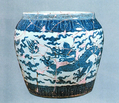 其一是清雍正年間內(nèi)務(wù)府員外郎唐英制造的一件圣物。雍正八年(1729),唐英奉命在景德鎮(zhèn)御窯廠辦理窯務(wù),他看到一件大型的明代“落選之損器”青龍缸被“棄置僧寺墻隅”。于是,他派遣兩人將這件損壞的青花龍紋大缸抬到一座祠堂旁邊,并修筑了一個(gè)高臺(tái)來(lái)安置它。這種古怪的行為引起了人們的困惑,唐英為此作《龍缸記》一文,回答他人的疑問(wèn)。按照該文的解釋,這件破損的大缸是窯神童賓的化身。為了證明“神所憑依”,唐英對(duì)扭曲殘破的龍缸作精彩的描述與闡發(fā):
