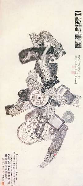 與唐英的手段不同,這是一種純粹的藝術(shù)創(chuàng)作。清道光十二年,六舟精心制作了一幅拓片。四年以后,他用這幅拓片賀贈(zèng)借庵和尚82歲壽誕。圖中一個(gè)巨大的“壽”字用了三十多件或完整或破碎的古物拓片拼合而成,包括碑志、瓦當(dāng)、錢幣、磚文等等,除了少數(shù)體量較小的錢幣可見(jiàn)其全形,大部分殘磚斷瓦上的文字零落不成章句。這些可辨而不可讀的文字,使得歷史既親切又遙遠(yuǎn)。近處看時(shí),這些彼此互不相關(guān)的文字碎片,好像隨意散亂地疊壓在一起,顛倒陸離,漫無(wú)用心;遠(yuǎn)觀方知它們經(jīng)過(guò)了作者苦心的經(jīng)營(yíng),碎片的墨色濃淡不一,構(gòu)成了“壽”字張弛有度的結(jié)構(gòu)和用筆。