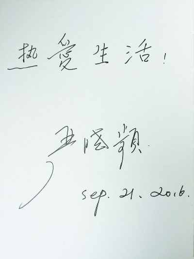 當(dāng)記者請嚴(yán)曉頻為《北京晚報(bào)》讀者寫點(diǎn)什么時(shí),她說:“我最常寫的一句就是‘熱愛生活’?!眹?yán)曉頻是個(gè)完美主義者,寫完一遍不滿意又反復(fù)練了兩遍,才再次欣然提筆。