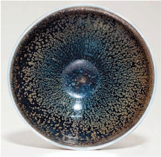 宋代斗茶藝術(shù)傳到日本,經(jīng)過吸收發(fā)展的抹茶道,能夠很好地流傳下來。優(yōu)美而稀少的建盞長期以來是日本上層階級珍藏的寶物,尤其在15世紀達到高潮?!毒_觀左右?guī)び洝酚涊d,曜變是建盞之無上神品,世上罕見之物,值萬匹絹。油滴是第二重寶,五千匹絹,兔毫盞,三千匹絹。當今,優(yōu)秀的建盞大都被日本收藏。僅存于世的3件曜變都被日本藏為國寶。油滴傳世品也僅10余件,其中一件為日本國寶。我國沒有一件完整的油滴。藏于日本靜嘉堂文庫的曜變被國際陶藝界公認為天下第一名碗并譽為陶瓷藝術(shù)的珠峰,但至今無人能復制,這也就可以理解當年為什么會有1500套別墅總和的高價了。