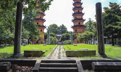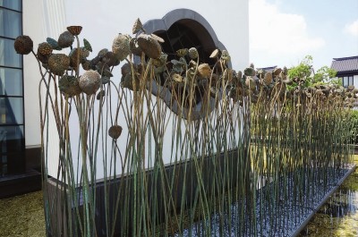 蘇州城東南角定慧寺巷內(nèi)的雙塔下,磚草掩映著北宋羅漢院的廢墟遺址。在這里,人們將與藝術(shù)家呂美立和王謙的作品 《有無》 相逢。這是分3列排開的數(shù)十只陶盤,用從蘇州各個地方搜集而來的泥土混合燒制成,盛放在其中的是蘇州各個水域的水。它們似乎是確鑿的存在,然而隨著時間的推移,陶盤以及盤中的水都在發(fā)生著微妙的變化,水會揮發(fā)、流動,陶盤也會受到風(fēng)化、侵蝕。遙遠(yuǎn)的以后,它們或許都將化為一抔塵土、一片荒草,這讓人不禁聯(lián)想起腳下北宋羅漢院的命運(yùn)。老子云“天下萬物生于有,有生于無”,當(dāng)今藝術(shù)家們的創(chuàng)作與有著千年歷史的雙塔彼此觀照,述說著新與舊、有與無的相互轉(zhuǎn)化。