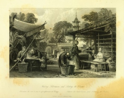 銅版畫《江南婦女繅絲》,1843年收錄于英國版畫家阿隆姆出版的有關(guān)中國的銅版畫集中。畫家未到過蘇州,而是根據(jù)別人的描述加以想象創(chuàng)作。