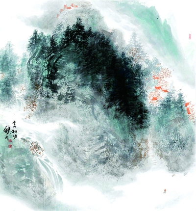 《旭日東升》在畫面構(gòu)圖中,畫家將嶺峰組合、云霧交織、瀑樹穿插等表現(xiàn)要素有機(jī)聯(lián)系起來,并將其規(guī)律有序地調(diào)度在畫面上,呈現(xiàn)出群山縱橫、層次分明、舒朗有序的局面,給人自然和諧的感覺。在畫幅中央位置,近景蒼松襯托著中景的主峰,主峰昂首天外呼應(yīng)著遠(yuǎn)景的紅日,使構(gòu)圖平中見奇,并借助中國山水畫中的深遠(yuǎn)法強(qiáng)化畫面空間感,讓人似乎置身其境,目睹霞光重嶺,感受到旭日東升的藝術(shù)境界。