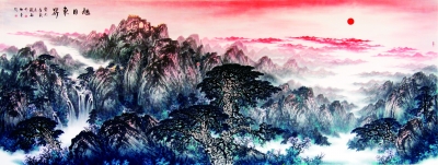 在《旭日東升》畫作中,比較突出的一點就是畫家采用濃烈的朱砂紅來表現(xiàn)紅日、云空和朝陽下的重重山川,這是此幅佳作中最響亮、最耀眼的一筆。這種設(shè)色大大增添了畫面裝飾感,形成強(qiáng)有力的視覺沖擊。這還不止,畫家還遵循紅日普照山川的自然規(guī)律對畫面做了添光增彩的渲染,讓承天接地的紅基調(diào)占據(jù)了畫幅主導(dǎo)位置,成為烘托主題氣氛、營造畫面意境的得力要素?!缎袢諙|升》畫作上鮮艷的紅色調(diào)連著主題、連著意境,讓人激動。試想,若將此幅畫面上的朱砂紅改變或者減弱,《旭日東升》的藝術(shù)感染力將會黯然失色,甚至畫面意境將會消退。在中國山水畫中,尤其是傳統(tǒng)畫法中,概念用色是常見的方法,因此,大膽使用主觀顏色往往可以獲得意想不到的效果。